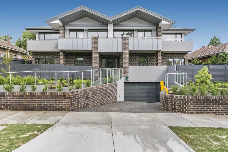 This low-level apartment development appears as two levels, with deep eaves and lower level basement below. In addition to car parking, the lower level also includes storage for bikes and storage cages for residents.